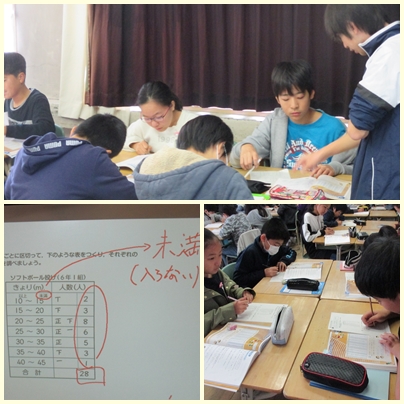 6年生が算数の授業でちらばりの様子を表す表をつくっていました。「以上」と「未満」の言葉も学んでいました。
