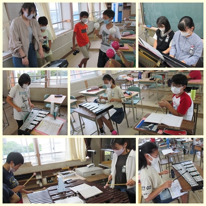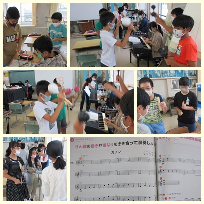 6年生が音楽の授業で色々な楽器を演奏して、「カノン」という曲を合奏します。今日は、楽器ごとにわかれて練習しました。