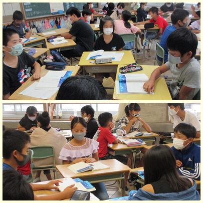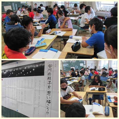 6年生が国語の授業で物語文「やまなし」の12月の谷川の様子を思い描いていました。友達の話を聴き合い、よく聴いて学んでいました。