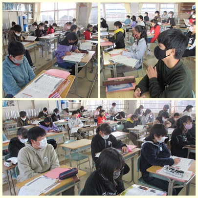 6年生が音楽の授業で「おぼろ月夜」の曲を歌うためにどのような強弱で歌ったらぴったりいくのか、歌詞や旋律のもつリズムや流れを生かして歌うにはどのように歌ったらよいのか、曲を聞きながら考えていました。