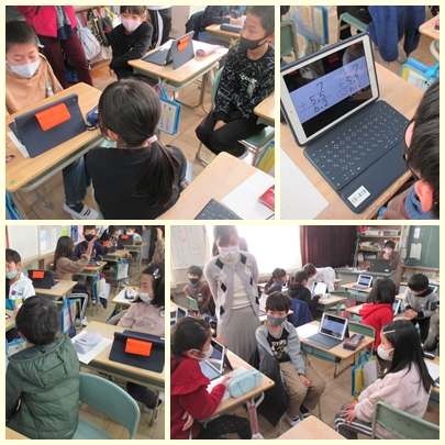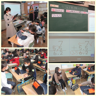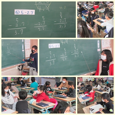 3年生が算数の授業でタブレット端末をうまく使って、一人一人が学びを深めることができました。5−2.7の計算が難しかったようです。ジャンプの問題は、200−0.86です。どの子も真剣に問題を解いていました。ポイントは「位をそろえる」「整数の筆算と同じように計算」「答えの小数点は上にそろえる」です。