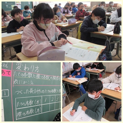 4年生が算数の授業で表に書いて変わり方を調べていました。同じ長さのストロー18本を並べて色々な長方形を作ります。作った長方形の縦の本数と横の本数の関係を表に整理して、表から気がついたことを発表していました。
