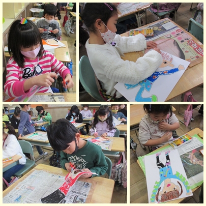 1年生が図工の授業で自画像をかいていました。この自画像は切り取って廊下に掲示します。