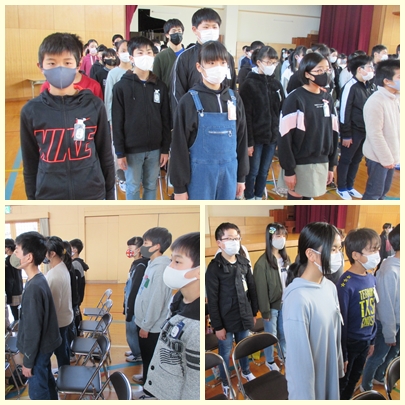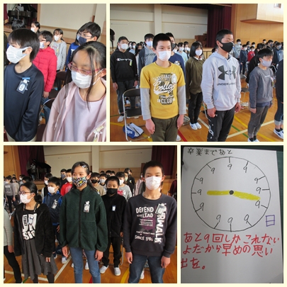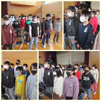 6年生が体育館で卒業式の練習を行っていました。卒業式の一連の流れを聞いて、動きをおぼえていました。
