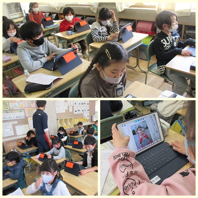 2年生が生活科の授業で自分の成長記録をタブレット端末を使ってまとめ、発表する取り組みをしていました。ただ今、作成中です!