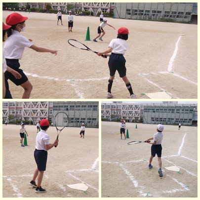 4年生が体育の授業で三角ベースをしていました。ラケットで打っていましたので、面が広い分、しっかりと打ち返すことができていました。