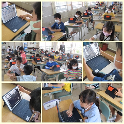 4年生が音楽の授業で「ソ・ラ・シ・ド・レ」から音を選んで音の動き方を矢印で書いて、つくった音型を音楽アプリの鍵盤を使って音を出して発表しました。