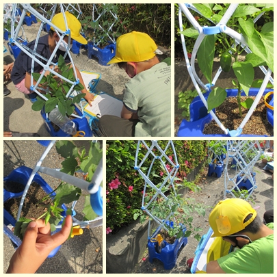 2年生が生活科で育てている野菜の観察記録をかいていました。ピーマンやオクラなど小さいながらも実ができていました。今日は、肥料もやりました。