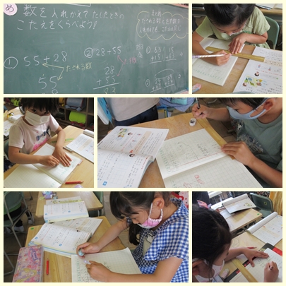 2年生が算数の授業で数を入れかえて、たしたときの答えをくらべていました。55+28と28+55の答えをくらべていました。