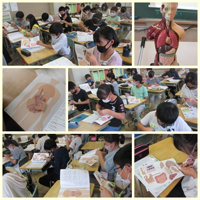 6年生が理科の授業で人のからだのつくりを教科書の巻末にある紙の人体模型をつくって、確かめていました。また、実際に人体模型を組み立てて確認もしていました。