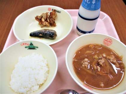 <献立> ごはん・牛乳・新玉ねぎのみそ汁・いわしの梅煮・ごぼうのサクサク揚げ