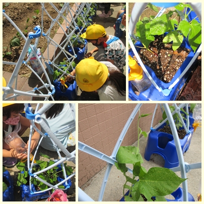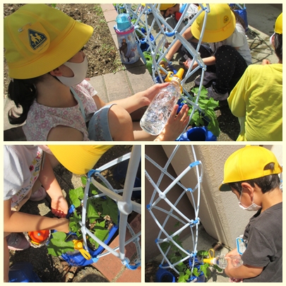1年生が生活科の授業であさがおの世話を熱心にしていました。水と追肥をやっていました。つるが支柱にまきつくほどぐんぐん成長してきました。
