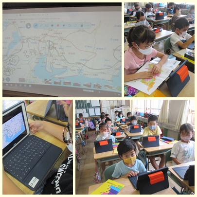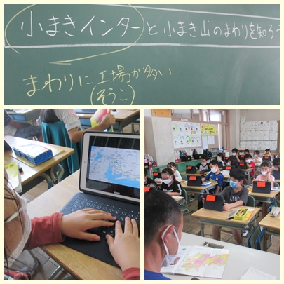 3年生が社会科の授業で副読本「こまき」の画像資料(小牧インターチェンジの地図など)を使って、インターチェンジの周辺を調べていました。工場や倉庫が多いことがわかりました。