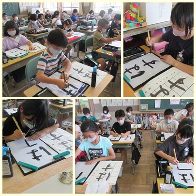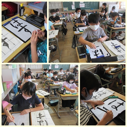 4年生が書写の授業で毛筆で「はす」をかいていました。「結び」の筆使いに気をつけてかいていました。