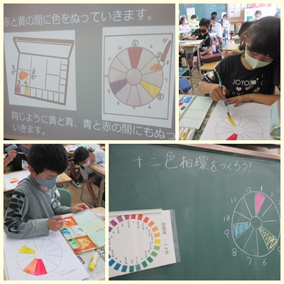 5年生が図工の授業で十二色相環をつくっていました。水彩絵の具で彩色するときの色の作り方を学んでいました。