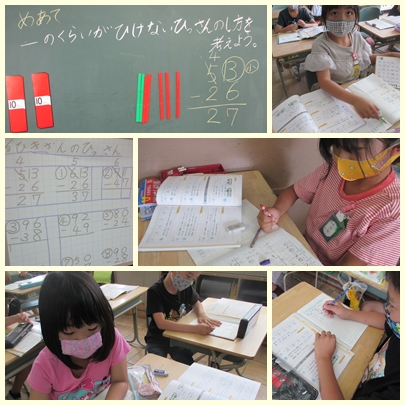 2年生が算数の授業で53−26の筆算の仕方を考えていました。数え棒を使って、一の位は3−6でひけないけれど、十の位から1繰り下げて13−6で7。十の位は1繰り下げたから、4−2で2。答え27と説明していました。