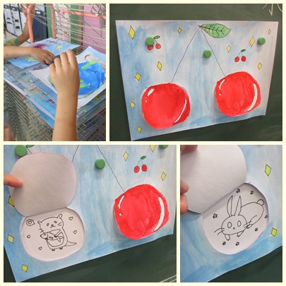 3年生が図工の授業で絵の中に開くしくみをつくって、開くことで広がる世界を想像しながら表していました。どんな世界が広がっているのかな?思わず開きたくなりました。