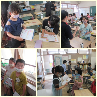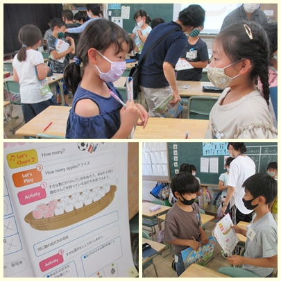 3年生が外国語活動の授業で個数を質問して、個数を答える会話を学んでいました。「How many apples ?」「One,two,three,four,five apples.」好きな数だけりんごに色をぬり、同じ数のりんごをぬっている友達を会話しながら探していました。