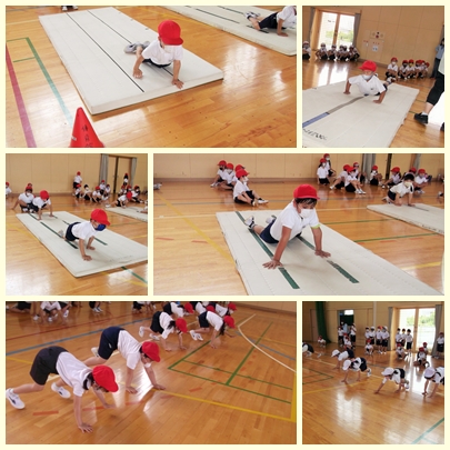 1年生が体育の授業でマットを使った遊びを楽しそうにしていました。