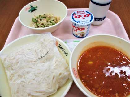 <献立> ソフトめん・牛乳・トマトソース・バンバンジーサラダ・ヨーグルト
