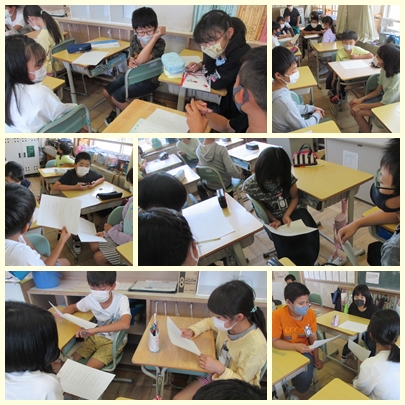 6年生が国語の授業で金子みすゞさんの「仲なおり」の詩を読んで、グループや全体でどんなことがかかれているのか想像していました。持ちこみ教材です。