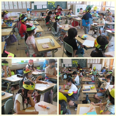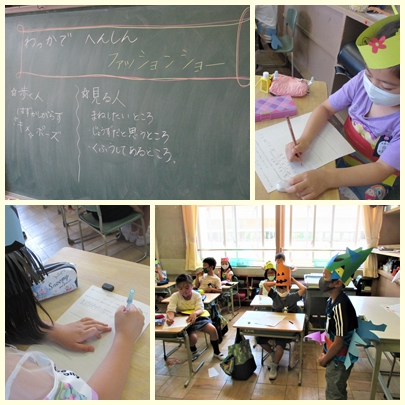 2年生が図工の授業で、わっかで変身した姿をみんなに見てもらって、友達の作品のよいところをワークシートにかいていました。