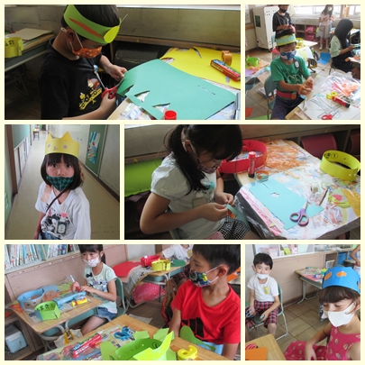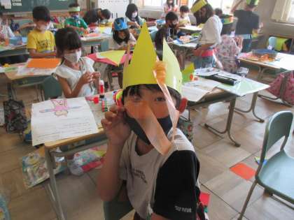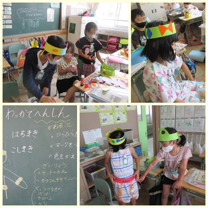 2年生が図工の授業で輪に飾りをつけて、自分が変身するものを楽しそうにつくっていました。何に変身しようかな?