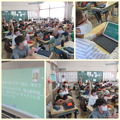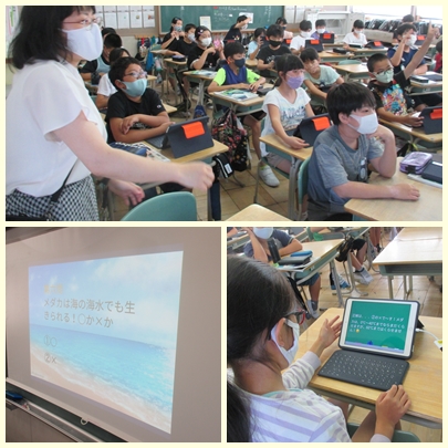5年生はこれから理科の授業でメダカを育てて卵をうませ、メダカの子どもがうまれるまでの卵の変化を観察していきます。今日は、メダカを飼うにあたってうまくメダカを育てていくために飼い方を調べてメダカクイズをつくりました。みんなでメダカクイズに答えながら上手な飼い方を共有しました。「メダカは海水でも生きられるか?」などです。