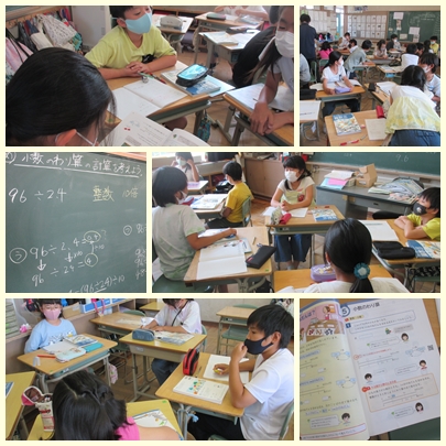 小数のわり算(5年生) 公開日 2021/06/10 更新日 2021/06/10 5年生 5年生が算数の授業で2.4mで96円のひも、1m分のねだんを求めていました。10倍して、24mだと960円だから1m分は960円÷24で1mのねだんを求めていました。 いいね(0)