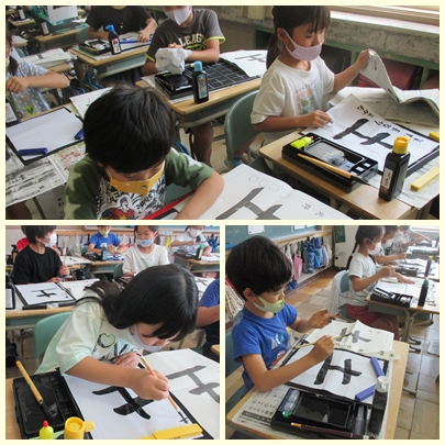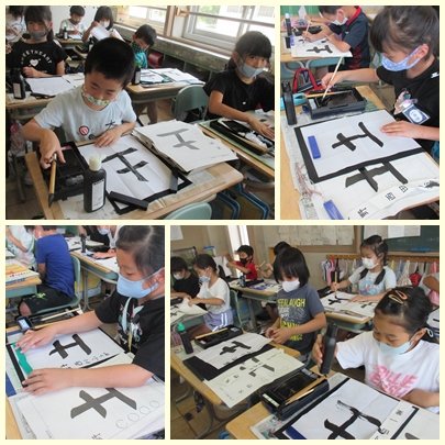 3年生が書写の授業で「縦画」の筆使いに気をつけて、「土」をかいていました。