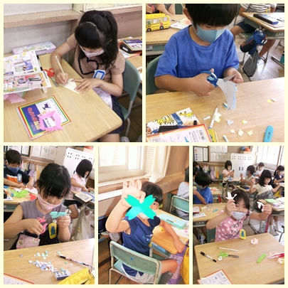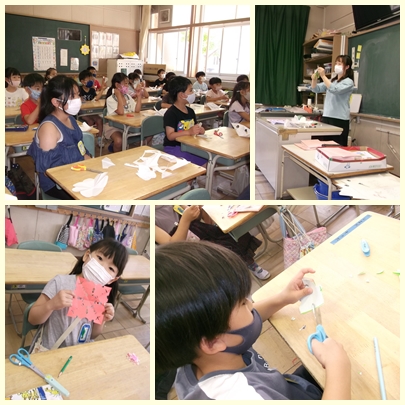1年生が図工の授業で紙を折ったり、重ねたりしてハサミで切って飾りをつくっていました。楽しそうに「ちょきちょき飾り」をつくっていました。