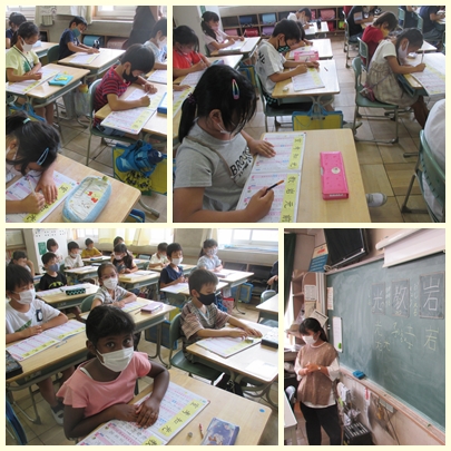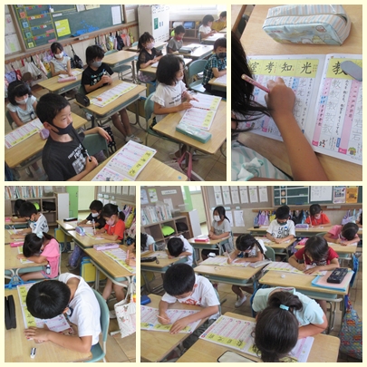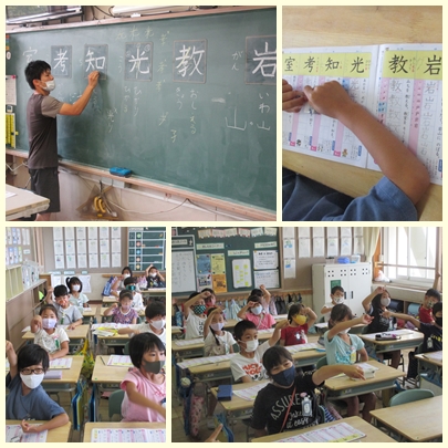 2年生が国語の授業で漢字ドりルを使って新出漢字を学んでいました。「前・元・岩・教・光・知・考・室」などです。