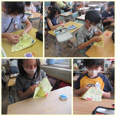 5年生が家庭科の授業で手ぬいの仕方を学んでいました。返しぬい(本返しぬい・半返しぬい)の練習をしていました。手ぬいができるようになったら、小物をつくるそうです。