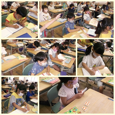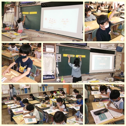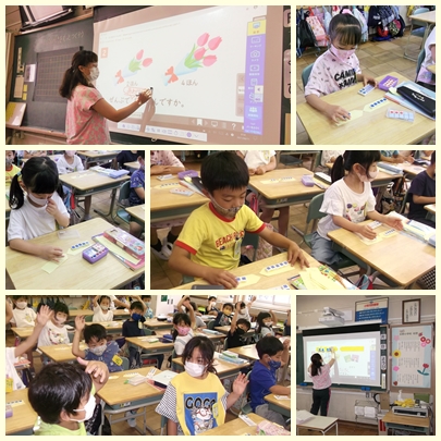 1年生が算数の授業で数図ブロックを使って、たし算の問題を解いていました。