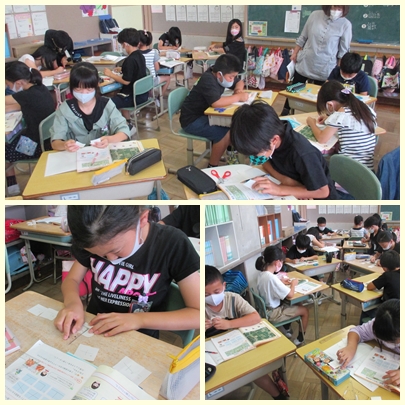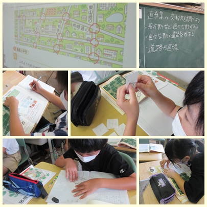 4年生が算数の授業で直線の交わり方を調べていました。三角定規を使って、交わってできる角が直角のものと直角でないものを調べていました。