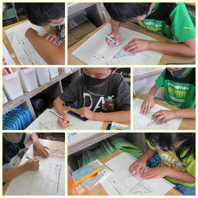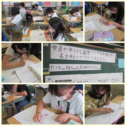 4年生が算数の授業で縦4センチ、横6センチの長方形を三角定規やものさしを使ってかいていました。向かい合う辺の平行を使ったかき方と向かい合う辺の相等を使ったかき方があります。