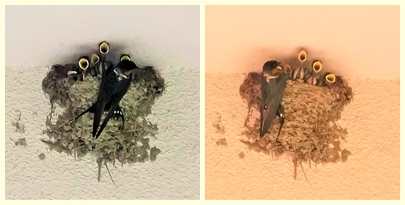 ツバメのひなが大きな口を開けて、鳴きながらえさをもらっています。ひなは全部で5羽います。