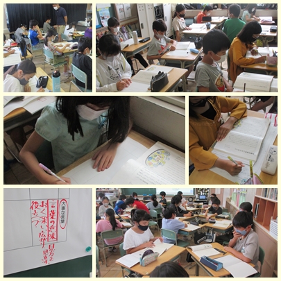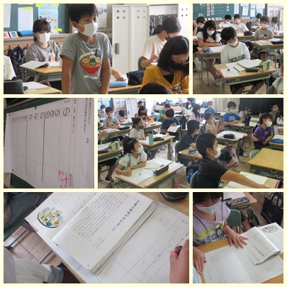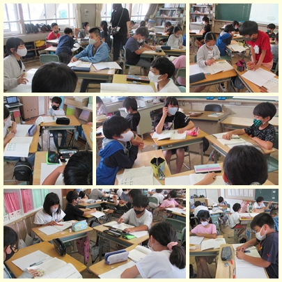 5年生が国語の授業で説明文「言葉の意味が分かること」の内容を読み取っていました。段落ごとに要旨をまとめるために大事な言葉や文を探して、要約していました。