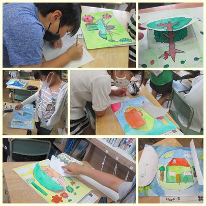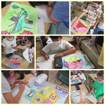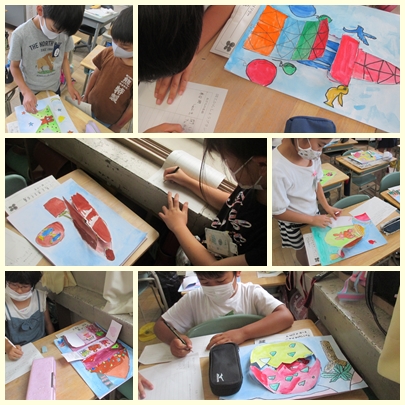 3年生が図工の授業でつくった作品「開いて広がる 不思議な世界」を鑑賞して、友達の作品のよいところを書き出していました。