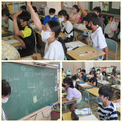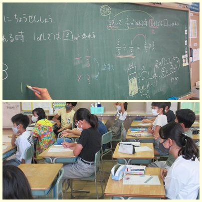 6年生が算数の授業で3分の1デシリットルで5分の3平方メートルぬれるペンキで、1デシリットルぬれる面積を求めていました。5分の3÷3分の1の式になるわけを説明していました。