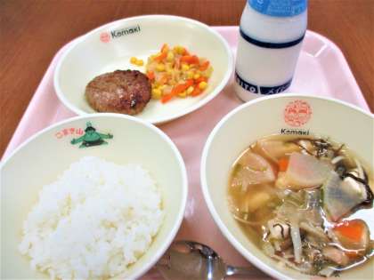 <献立> ごはん・牛乳・もずく汁・和風ハンバーグ・三色いため