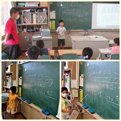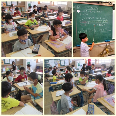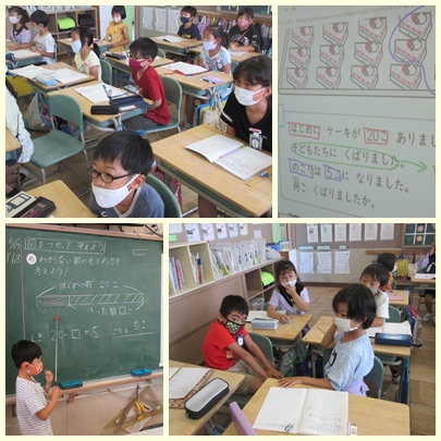 2年生が算数の授業で図をかいて、わからない数の求め方を考えていました。はじめの数からくばった数をひくと、残りの数になること使って説明していました。