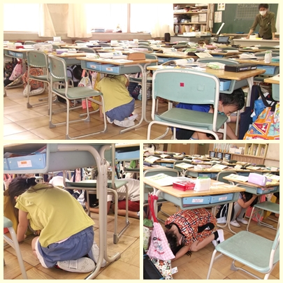 本日、午前10時にシェイクアウト訓練を行いました。緊急の地震アラームが鳴った場合、身を守る行動がいち早くできるように、姿勢を低くして、頭を保護し、じょうぶな机などの下などに一次避難し、揺れが収まるまで動かないようにするという訓練です。全校で行いました。1年生も担任の先生や放送の指示に従った行動がとれていました。