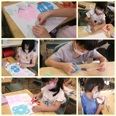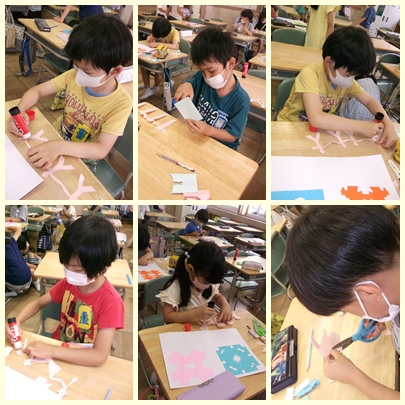 1年生が図工の授業で色紙を折ったり、重ねたりしてハサミで切って楽しい形をつくっていました。とてもおもしろい形が次から次へとできていました。