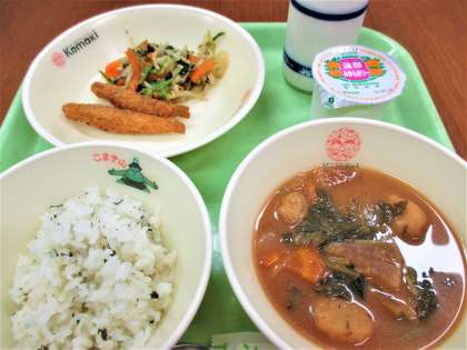 6月18日(金)今日の給食 公開日 2021/06/18 更新日 2021/06/18 学校給食 <献立> 愛知の大根葉ごはん・牛乳・愛知のめぐみみそ汁・めひかり(魚)フライ・千草あえ・蒲郡みかんゼリー いいね(0)