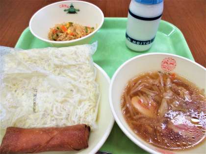 <献立> 中華めん・牛乳・しょうゆラーメン・愛知のしそ入り鶏春巻き・春雨サラダ