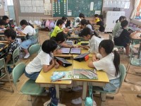 5年生が図工の授業で多色刷りの版画にチャレンジしていました。彫刻刀を使って、木版をつくっていました。