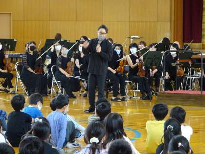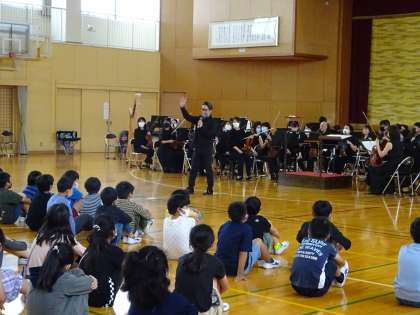 中部フィルハーモニー交響楽団の皆さんが,米野小学校体育館で演奏をしてくださいました。今年度は,体育館での密を避けて,4〜6年生が鑑賞しました。