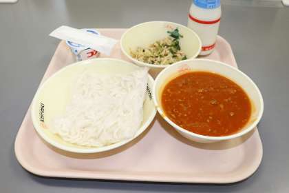 牛乳 ソフトめん ミートソース バンバンジーサラダ ヨーグルト