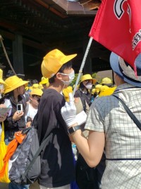 法隆寺でバスガイドさんの話を聞き、しっかり学んでいます。